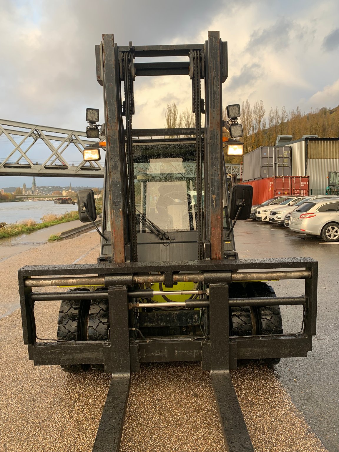 | Équipements | 4 voies hydrauliques, TDL (déplacement latéral), Cabine, Positionneur de fourches |