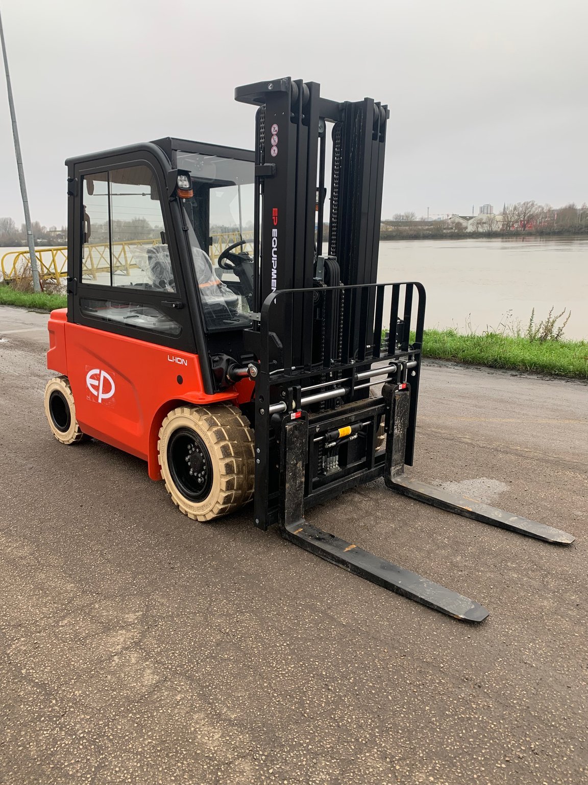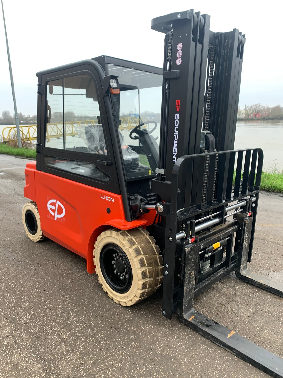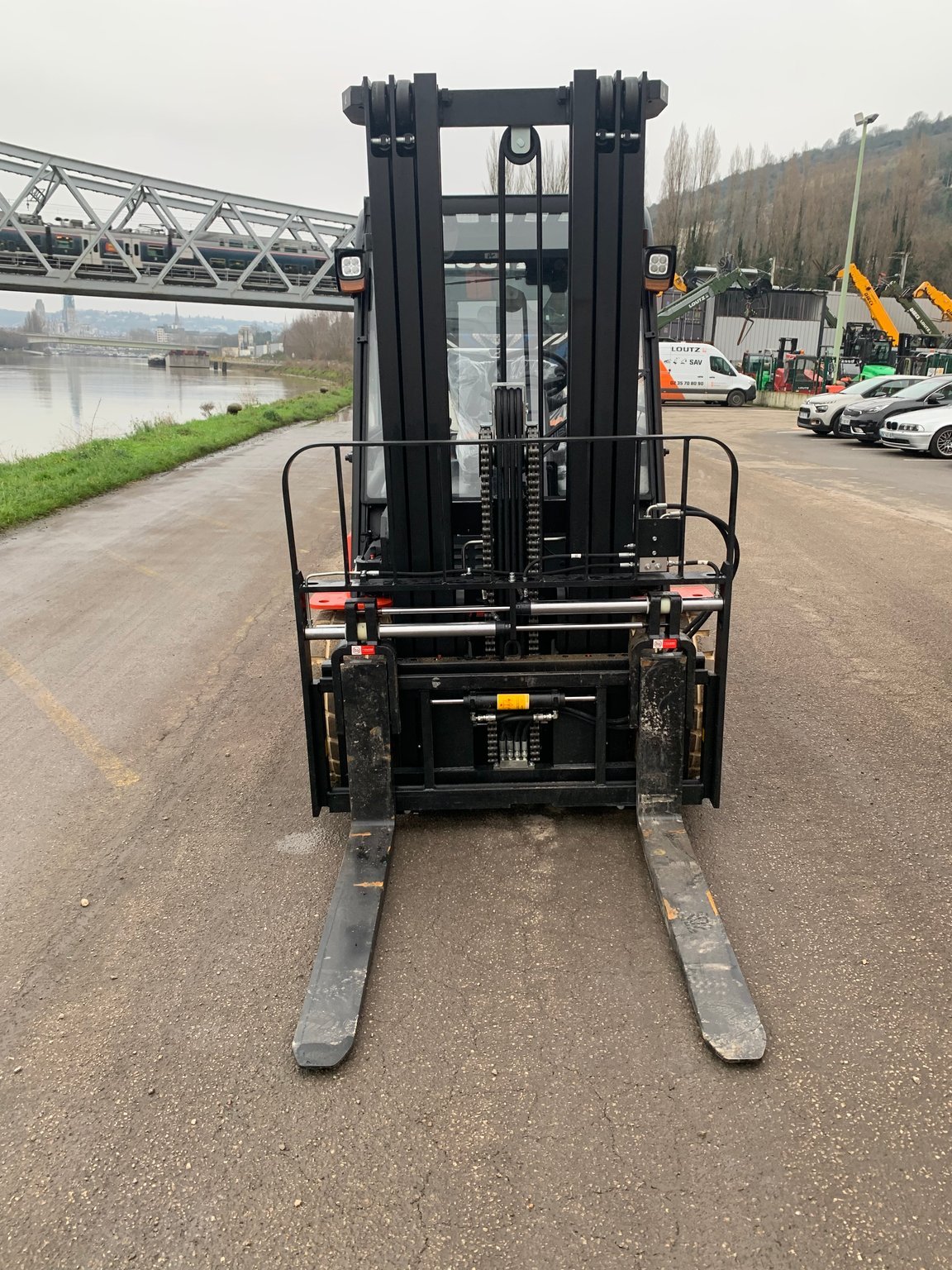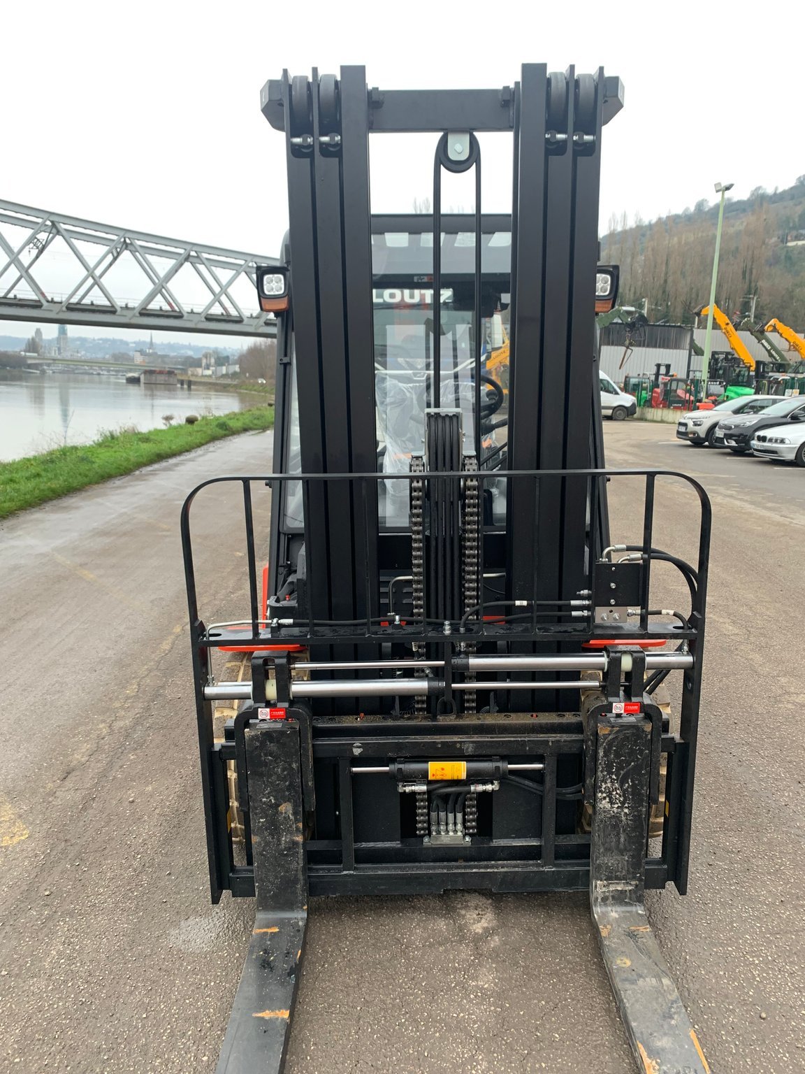 | Équipements | 4 voies hydrauliques, Batterie, Blue spot arrière, Cabine, Dosserêt d'appui de charge, TDL (déplacement latéral), Positionneur de fourches |